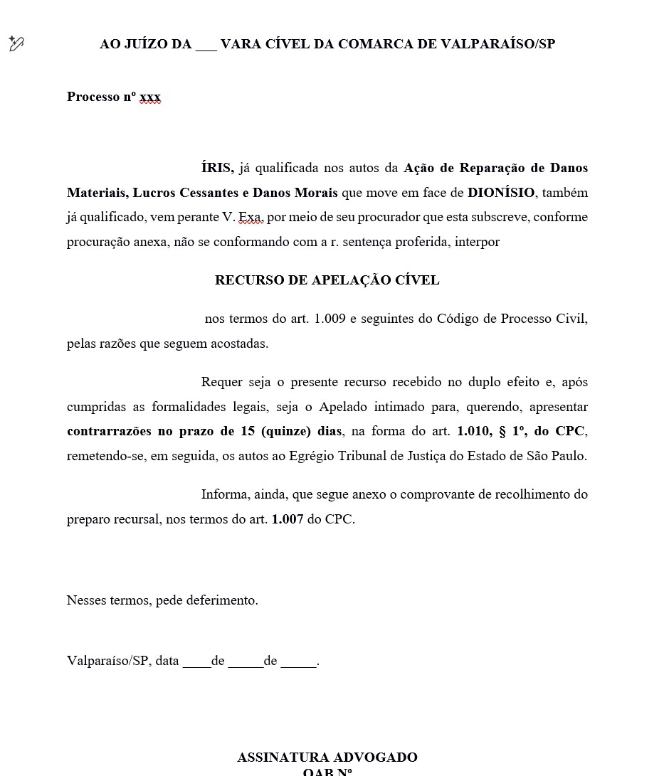 A Sra. Íris, uma renomada fotógrafa de casamentos da cidade de Valparaíso, procura seu escritório. Ela está visivelmente desapontada e lhe entrega uma cópia da sentença proferida em uma ação de indenização que ela moveu contra o Sr. Dionísio. Como o advogado anterior da Sra. Íris renunciou ao mandato que lhe fora outorgado, você foi procurado para avaliar o caso.
