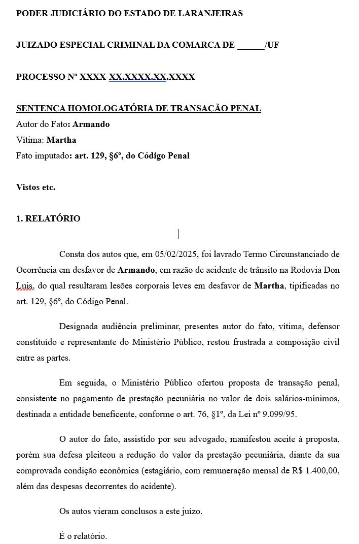Foi tentada a composição das partes, mas sem sucesso, pois Martha entendeu por bem praticar a representação penal naquela mesma oportunidade. Assim, o Promotor responsável, verificando presentes os requisitos, ofertou transação penal, porém, condicionado ao pagamento de dois salários mínimos. Armando entrou em desespero, pois com seu salário de estagiário (que comprovou com declaração de estágio juntado – R$ 1.400,00) e diante do valor dos reparos de seu veículo e do veículo da vítima (R$ 4.000,00) não conseguiria honrar com a condição imposta. Mesmo sob 2 Público protestos, o Promotor insistiu no valor. Dr. Bento, advogado de Armando, tranquilizou-o e recomendou aceitar o acordo, o que foi aceito e feito por Armando.